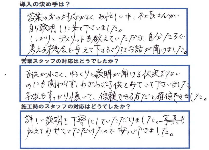 営業・施工ともに丁寧で安心できました。メリットだけでなくデメリットも説明してくださり、信頼してお願いできました。