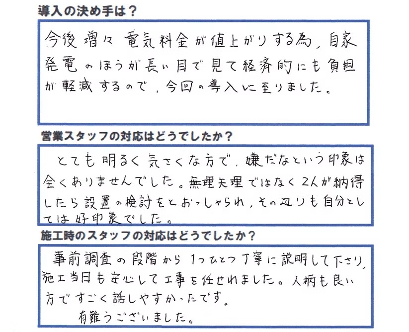 電気代の高騰を見据え導入を決めました。営業・施工ともに丁寧で、人柄も良く安心してお任せできました。